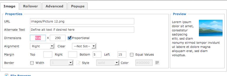 - Use the “Alignment” drop down to float the image left or right and allow text to wrap around it.